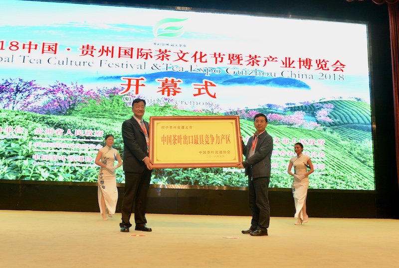 在简约隆重、气氛热烈的开幕式上,遵义市委龙长春书记、联合利华北亚区曾锡文副总裁、国际茶商代表以马利·贝特·凯穆泰先后致辞。随后,中国茶叶流通协会会长王庆发布《新时代贵州省产业之竞争力》并为获得首批“中国制茶大师”(绿茶类)殊荣的贵州湄潭绿之源茶业销售有限公司刘建辉、黔南州都匀茶场副场长欧平勇两位大师颁发了证书。接着,王庆会长与周国富会长先后向遵义市和湄潭县颁发了“中国茶叶出口最具竞争力产区”、 “中国茶工业博物馆”匾牌。最后,贵州省委副书记、省长谌贻琴发表讲话,并宣布2018中国·贵州国际茶文化节暨茶产业博览会开幕。